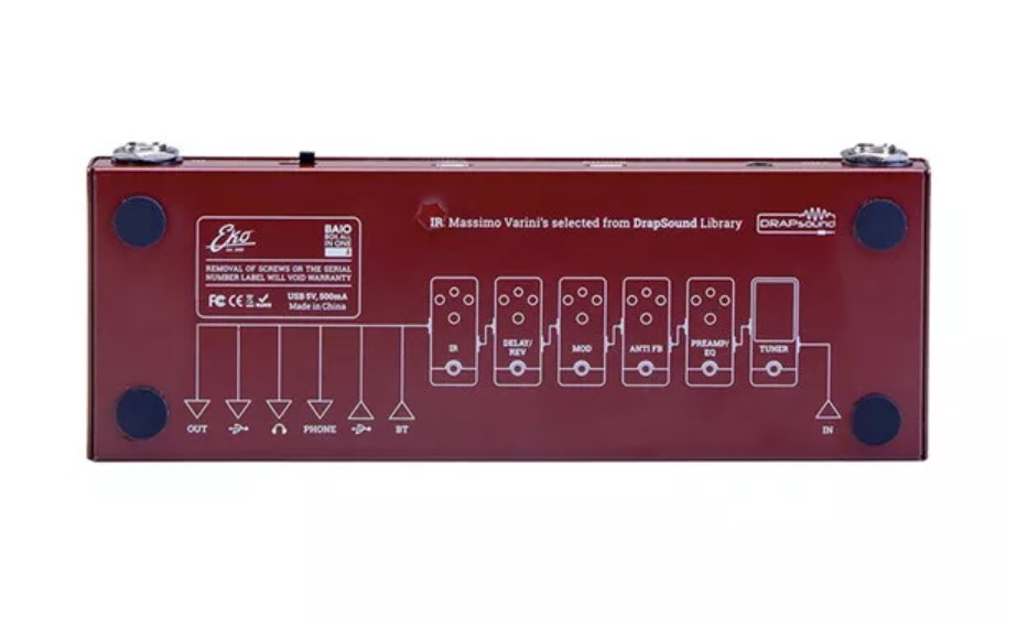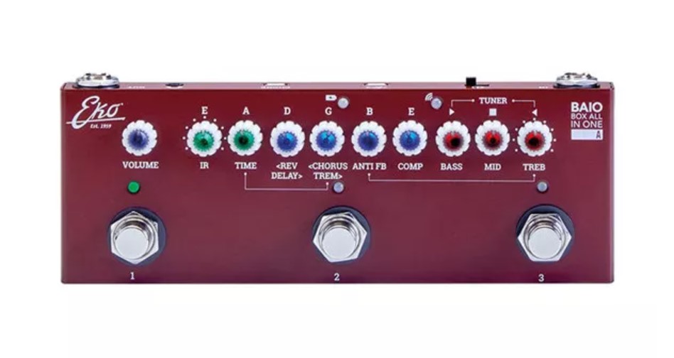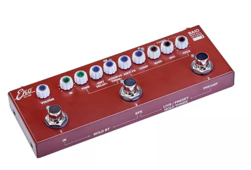 | Il Baio A è il pedale multieffetto con IR integrati per chitarra acustica, classica e basso acustico di Eko Guitars. Presenta 8 IR di strumenti acustici microfonati, controlli di tono completi, compressore, antifeedback, chorus, tremolo, reverb, delay, tuner incorporato con funzione di mute, ingresso e uscita jack per strumento, uscita stereo per le cuffie, connessione bluetooth e porte usb dedicate per l'utilizzo come scheda audio in ingresso sia per PC/Mac, sia per smartphone. Il pedale ideale con cui avrai i tuoi suoni sempre con te. Grazie ai suoi 16cm di lunghezza, appena 6cm di larghezza e 260g di peso, Baio è il sistema multieffetto all-in-one in grado di offrire tutte le caratteristiche e funzionalità indispensabili al chitarrista e bassista moderno. Facile da traportare e super resistente grazie allo chassis metallico, consente una gestione totale del proprio sound. Per la sezione preamp hai a disposizione un eq a tre bande, compressione e antifeedback. La sezione delle modulazioni, accessibile tramite il controllo Mod, consente di aggiungere chorus e tremolo; il delay e riverbero sono attivabili dalla apposita manopola, tempo del delay e quantità del riverbero regolabili dalla manopola Time. Il controllo IR consente di selezionare fra otto Impulse Response creati appositamente per Baio da Massimo Varini, il quale ha scelto e adattato alcuni fra i migliori IR marcati DrapSound. Con il controllo Out gestisci il volume in uscita e tramite i tre pulsanti a pedale potrai passare dalla modalità Preset per il cambio degli stessi, alla modalità Live che ti permetterà di gestire separatamente IR, Delay/Rev, Chorus/Tremolo e sezione preamp. Sempre con gli switch a pedale, puoi azionare il Bluetooth che ti consentirà di riprodurre le tue backing track preferite tramite un device esterno o attivare l'accordatore integrato, con il quale è possibile anche interrompere completamente il segnale in uscita (mute). Il pannello posteriore presenta due terminali jack standard per l'ingresso e l'uscita, l'interruttore d'accensione, la presa USB per l'alimentazione del pedale e la ricarica della batteria e la connessione al computer per l'utilizzo come scheda audio. Con la presa Phone è possibile utilizzare l'apposito cavo per collegare lo Smartphone e utilizzare Baio come scheda audio anche sul proprio telefono. E' presente altresì un'uscita per le cuffie che ti consentirà di ascoltare contemporaneamente il segnale dello strumento e un eventuale riproduzione Bluetooth. |
