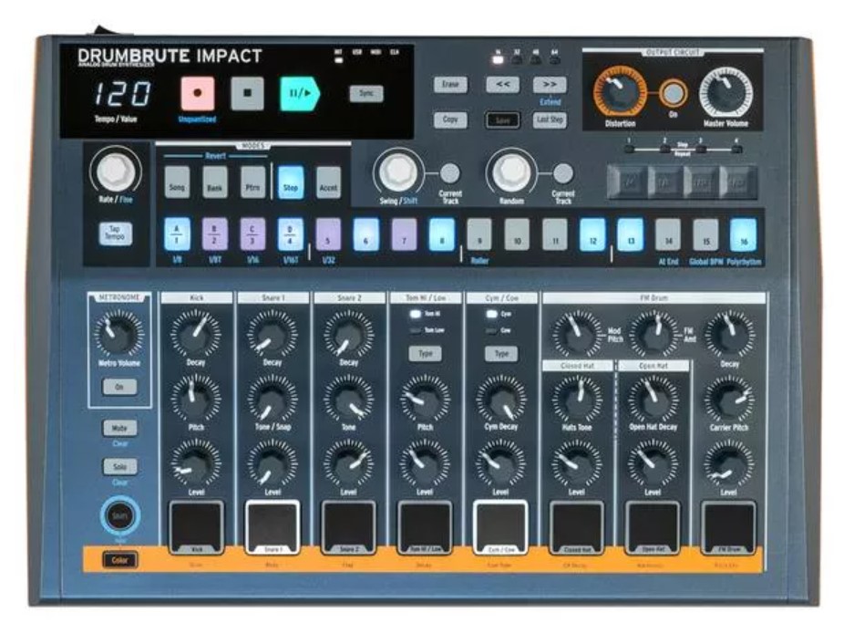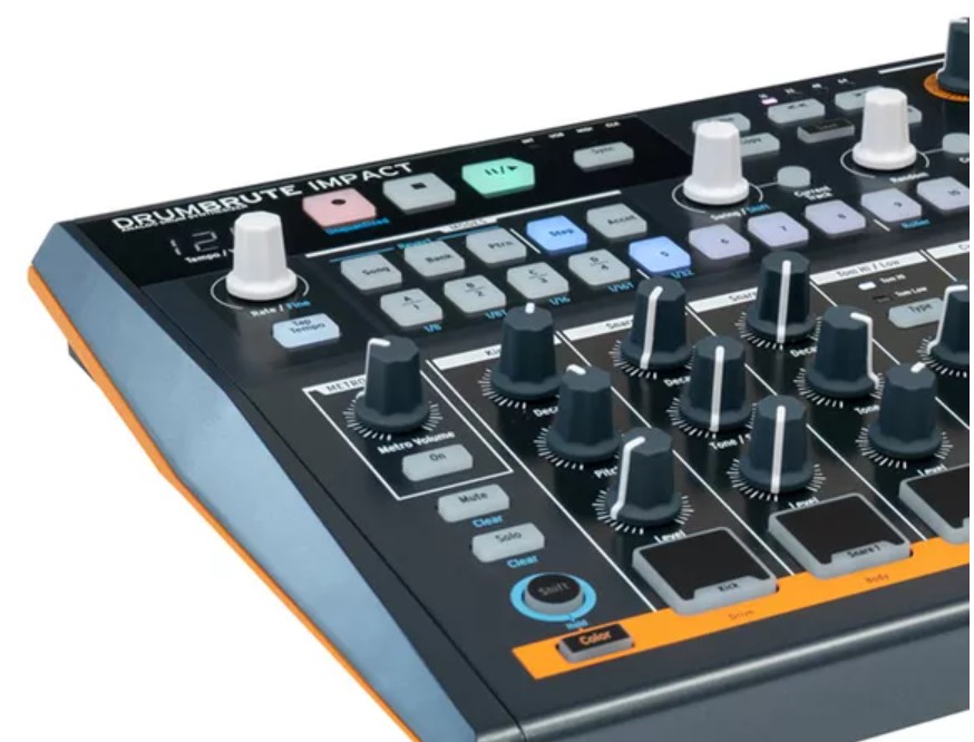 | DrumBrute Impact nasce sulla base del progetto di grande successo della casa francese DrumBrute, anche se in questo caso gli ingegneri di Arturia hanno progettato uno strumento molto differente rispetto al suo predecessore. Con la versione Impact si ha a disposizione un vero e proprio nuovo sound-set sempre con sonorità interamente analogiche complete di parametri regolabili di decay, pitch e snap. Il pannello è stato progettato per essere intuitivo e utilizzabile alla perfezione sia in studio che nelle performance live, con rotativi di ottima fattura che garantiscono affidabilità e massimo controllo. Per aumentare il contenuto armonico e conferire maggiore carattere al suono è stata aggiunta l'esclusiva funzione "Color". Questa funzione esclusiva della DrumBrute Impact può essere attivata per ogni singolo strumento, o per step, fornendo un nuovo livello di controllo tonale. Si può utilizzare la touch strip per creare in tempo reale glitch e step repeat, animare un singolo strumento o l'intero pattern con il potenziometro "Random" dedicato e aggiungere variazioni al groove con la funzione "Swing". Sia che si desideri creare complessi poliritmi in sequenza, ritmi diretti e martellanti o registrare una performance di finger-drumming, la Drumbrute Impact renderà quest'esperienza unica e divertente. Con una vasta gamma di opzioni di sincronizzazione e connettività, è possibile collegarsi e suonare praticamente con qualsiasi altro strumento. DrumBrute Impact è una drum machine per musicisti e produttori che ricercano potenza, controllo, connettività e affidabilità senza compromessi. |