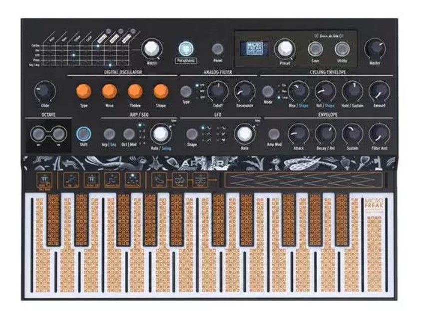 | Il MicroFreak di Arturia è un sintetizzatore hardware ibrido accessibile con oscillatori wavetable e digitali, filtri analogici, una matrice di modulazione, un touch plate non convenzionale ma estremamente espressivo e tonnellate di possibilità sonore. Il potente oscillatore digitale di MicroFreak offre una gamma di modalità uniche come Texturer, KarplusStrong, Harmonic OSC e Superwave, consentendo a tutti, dai principianti avventurosi agli esperti di sintetizzatori di esplorare nuove frontiere sonore. Arturia ha inoltre collaborato con il rinomato produttore di Eurorack Mutable Instruments per includere il loro acclamato oscillatore wavetable Plaits con aggiunta di parafonia. MicroFreak è una bestia estremamente versatile che può suonare in modo dolce, profondo, ipnotico, caotico, vulcanico. Qualunque sia il suono che puoi immaginare, MicroFreak è all'altezza. E MicroFreak ti consente di lavorare velocemente anche con funzionalità avanzate come la creazione di sequenze in tempo reale e la randomizzazione. La piastra touch incisa di MicroFreak sorprenderà tutti i tastieristi che, nel complesso, è più naturale ed espressiva di una tastiera convenzionale. Il touch plate è sensibile alla pressione e offre persino un aftertouch polifonico, che in questa fascia di prezzo è davvero sorprendente. Mentre il suo prezzo lo rende un complemento sonoro unico perfetto per qualsiasi set di musica elettronica domestica, l'unicità di MicroFreak di Arturia lo rende anche un'aggiunta senza paragoni alle piattaforme professionali di synth live e in studio. I professionisti lo troveranno utile come strumento per la progettazione sonora sperimentale, allo stesso modo dei moduli Eurorack. L'oscillatore digitale MicroFreak è lo strumento ideale per creare categorie di suoni completamente nuove, mentre il suo filtro analogico offre il calore e il punch che stai cercando. MicroFreak può memorizzare fino a 192 preset in modo che l'ispirazione non sia mai a più distante di un pulsante. La sintesi innovativa è la ragione d'essere di Arturia. E MicroFreak è all'altezza della reputazione. E' un sintetizzatore incredibilmente ricco di valore come nessun altro. I produttori di musica elettronica e le rock band apprezzeranno l'utilizzo di MicroFreak per generare trame insolite e sequenze in continua evoluzione in un ambiente live e aggiungere un tocco piacevole di imprevedibilità sonora ai loro spettacoli. |